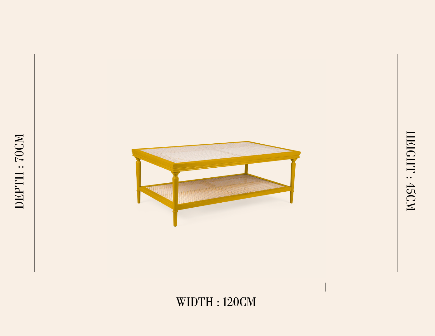 Our Gaia coffee table is the ideal centre piece for any sitting room. Featuring lacquered beech wood and natural woven cane beneath a glass shelf, the Gaia also boasts a recessed second shelf for further storage.
