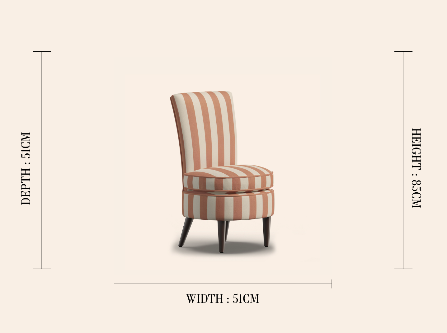 This beautiful occasional chair is offered in many different fabrics within our collections, it has a softly rounded back and an over-stuffed seat cushion, meaning comfort is never sacrificed in the pursuit of elegance.