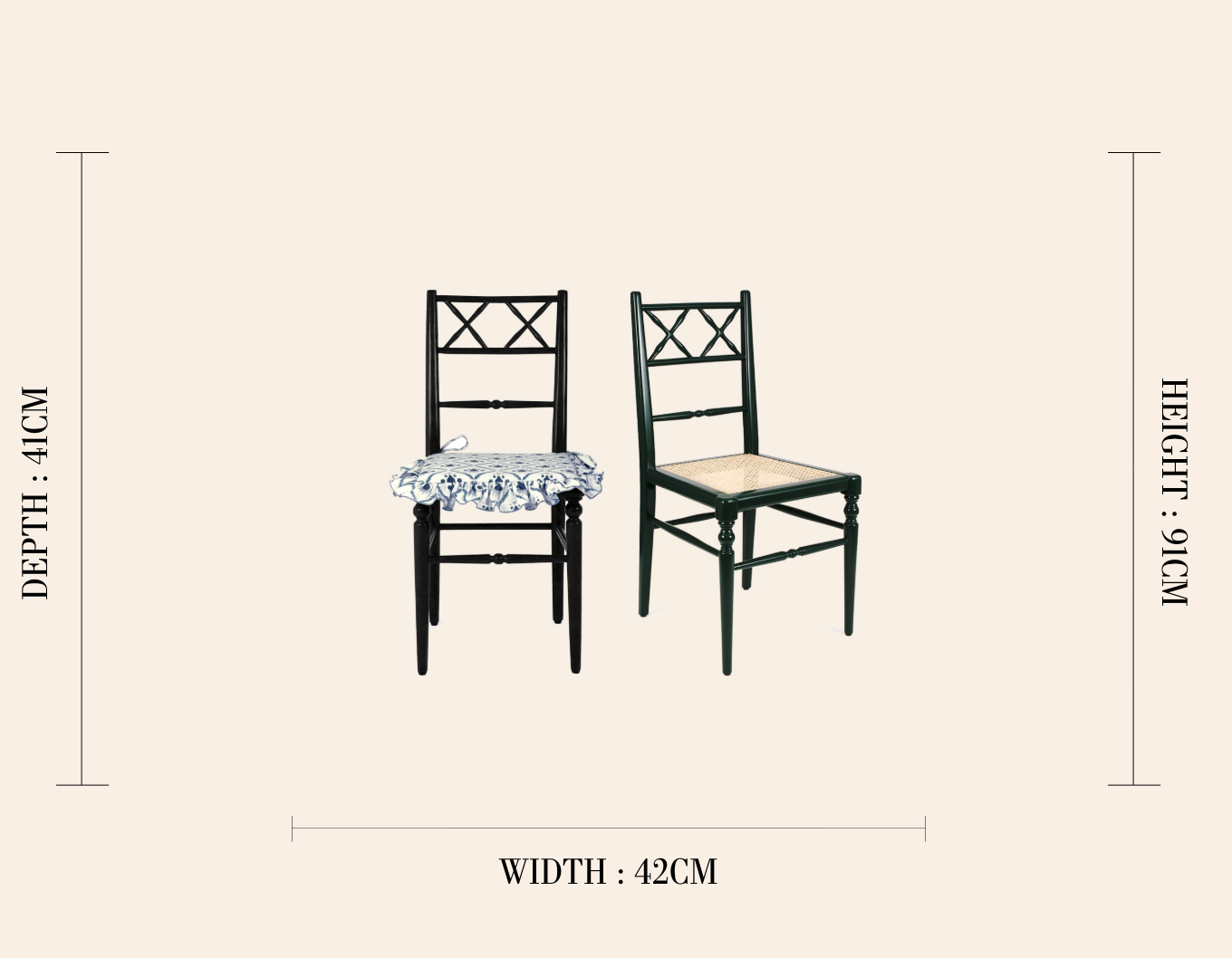 Chiara is a lacquered wood dining chair with a natural woven cane seat and would suit antique or contemporary dining tables.