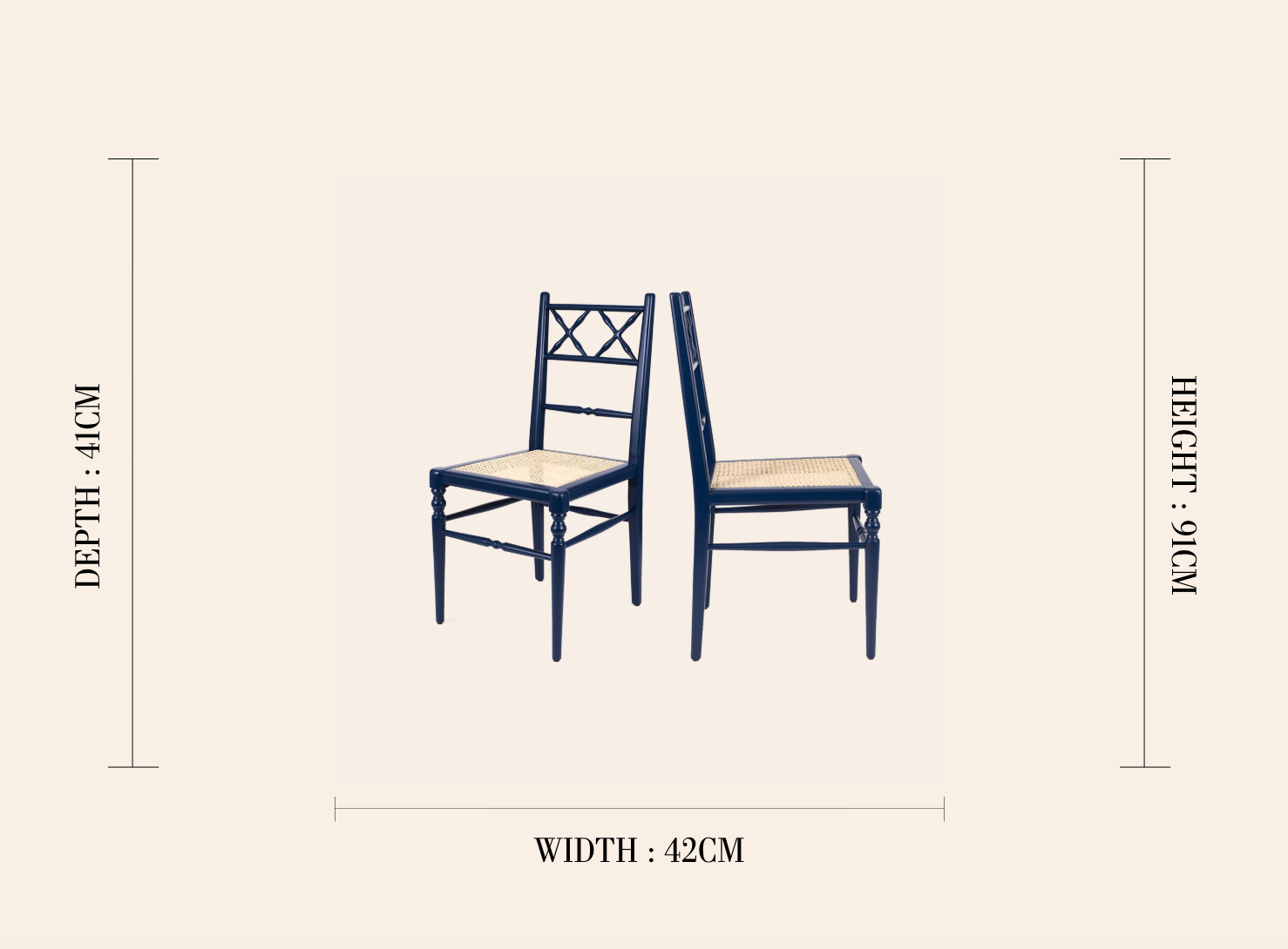 Chiara is a lacquered wood dining chair with a natural woven cane seat and would suit antique or contemporary dining tables.