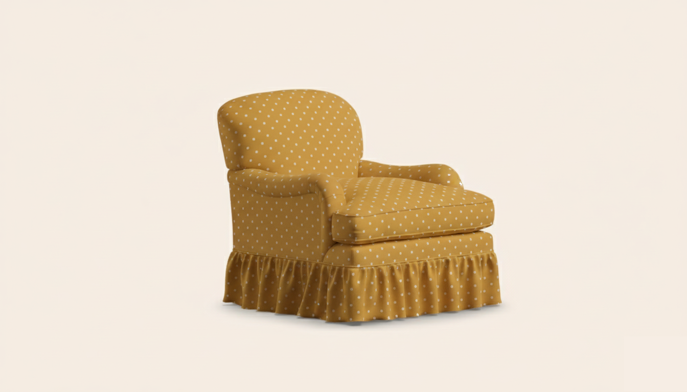 The Sofia here features our new Dolce Daisies fabric in Cannoli, made with 100% cotton.